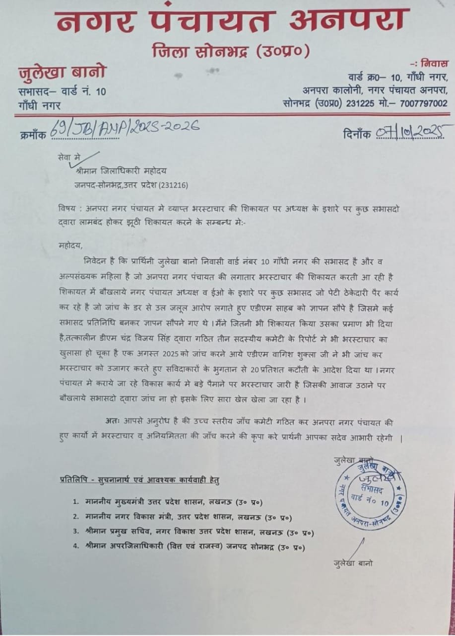 अनपरा नगर पंचायत वार्ड नंबर 10 गाँधी नगर की सभासद जुलेखा बानो ने जिलाधिकारी को लिखे पत्र मे कहा है कि अनपरा नगर पंचायत अध्यक्ष व ईओ के इशारे पर पेटी ठेकेदार बने कुछ सभासद लाम बंद होकर विकास कार्यों मे हुए व्याप्त भरस्टाचार की जांच को दबाने के लिए उल जलूल आरोप प्रत्यारोप लगा रहे है