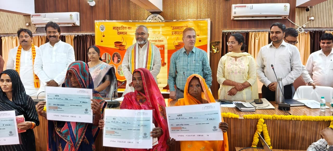 इस अवसर पर उज्ज्वला योजना के लाभार्थियों को डेमो चेक का वितरण मा0 जनप्रतिनिधिगण व अधिकारीगण द्वारा किया गया। इस अवसर पर जिला पंचायत अध्यक्ष श्रीमती राधिका पटेल ने कहा कि भारत के गरीब परिवारों की महिलाओं के चेहरों पर खुशी लाने के उद्देश्य से केंद्र सरकार द्वारा 1 मई 2016 को शुरू की गई एक योजना है। इस योजना के अंतर्गत गरीब महिलाओं को मुफ्त एलपीजी गैस कनेक्शन मिलेंगे।