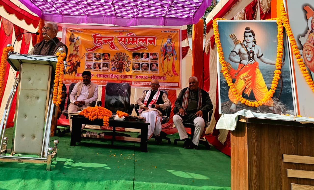 सोनभद्र सकल हिंदू समाज के द्वारा आयोजित हिंदू सम्मेलन केंद्रीय मंत्री विश्व हिंदू परिषद अम्बरीष के मुख्य आतिथ्य व वरिष्ठ समाजसेवी चिंतक लालजी त्रिपाठी के अध्यक्षता में विकासखंड करमा के सिरसिया ठकुराइ मंडल अंतर्गत पंचायत भवन जड़ेरुआ के प्रांगण में संपन्न हुआ। हिंदू सम्मेलन को संबोधित करते हुए विश्व हिंदू परिषद के केंद्रीय मंत्री अम्बरीष ने कहा कि हिन्दू सशक्त होगा तो पूरे देश का कल्याण होगा। जीवन मूल्यों की प्राण प्रतिष्ठा होगी। राष्ट्रीय स्वयंसेवक संघ की स्थापना जिस परिकल्पना के साथ हुई थी, उसमें हम सभी कहां खड़े हैं उन्होंने कहा कि दुनिया में पूर्व में कई देश पर आक्रमण हुए।